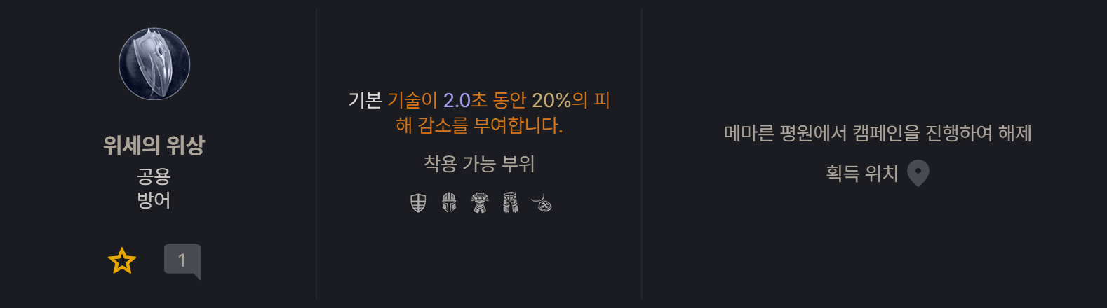 1) 재사용 대기시간 감소 #%: 투구, 목걸이, 보조 무기(중심점) → 총 3부위